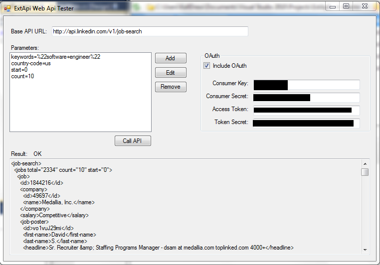 While working with the LinkedIn API, I started becoming frustrated in testing my API calls. The core reason was that I couldn’t just form my URL in the web browser due to OAuth. In order to test my API calls I would have to write code to perform the call, test it out, use the VS debugger to retrieve the result to make sure the XML it’s returning is what I expect, etc.. It results in a lot of wasted time and I finally got fed up.
